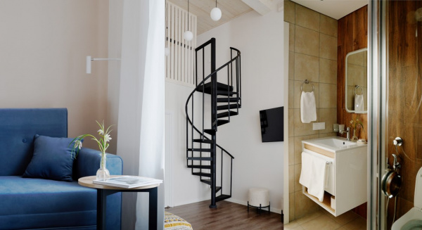 - шесть роскошных двухэтажных апартаментов, идеально подходящих для небольшой семьи (гостиная с кухней и обеденной зоной на первом этаже и спальня с санузлом и балконом на втором этаже),