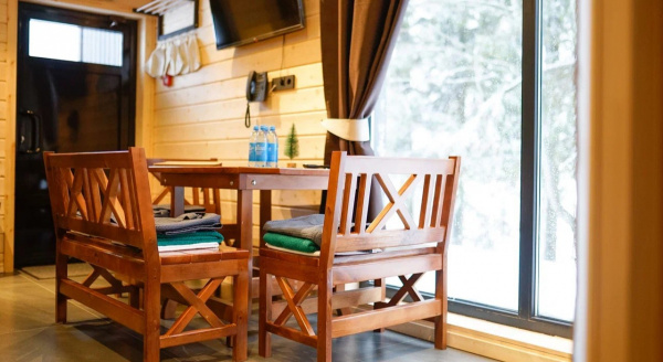 - четыре комфортабельных деревянных коттеджа с террасой, гостиной и двумя спальнями (в каждой спальне отдельный санузел в душем). С террасы коттеджей открываетс захватывающий вид на воды Ладожского озера,